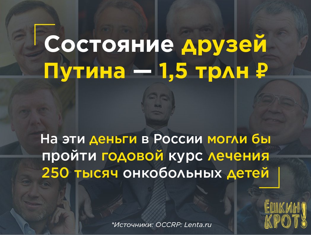 Удивительную силу дружбы лучше всего демонстрирует пример друзей нашего бессменного лидера. Почти все старые приятели Путина за время его президентства попали в списки Forbes. По подсчётам расследователей OCCRP, состояние семьи и друзей Путина оценивается в ≈1,5 трлн рублей (или $24 млрд).