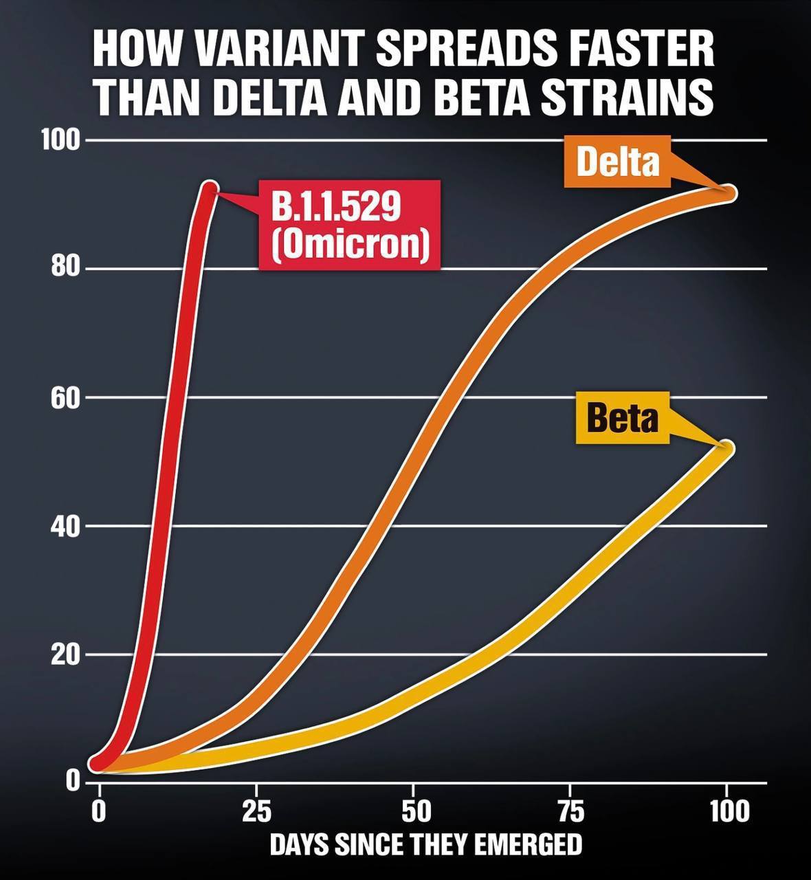 Коронавирус никак не даёт всему миру расслабиться. Новый штамм «омикрон» уже выявлен в Европе. Судя по графику, распространяется он ещё быстрее, чем все предыдущие.